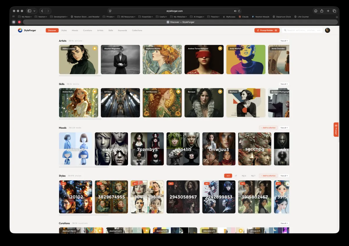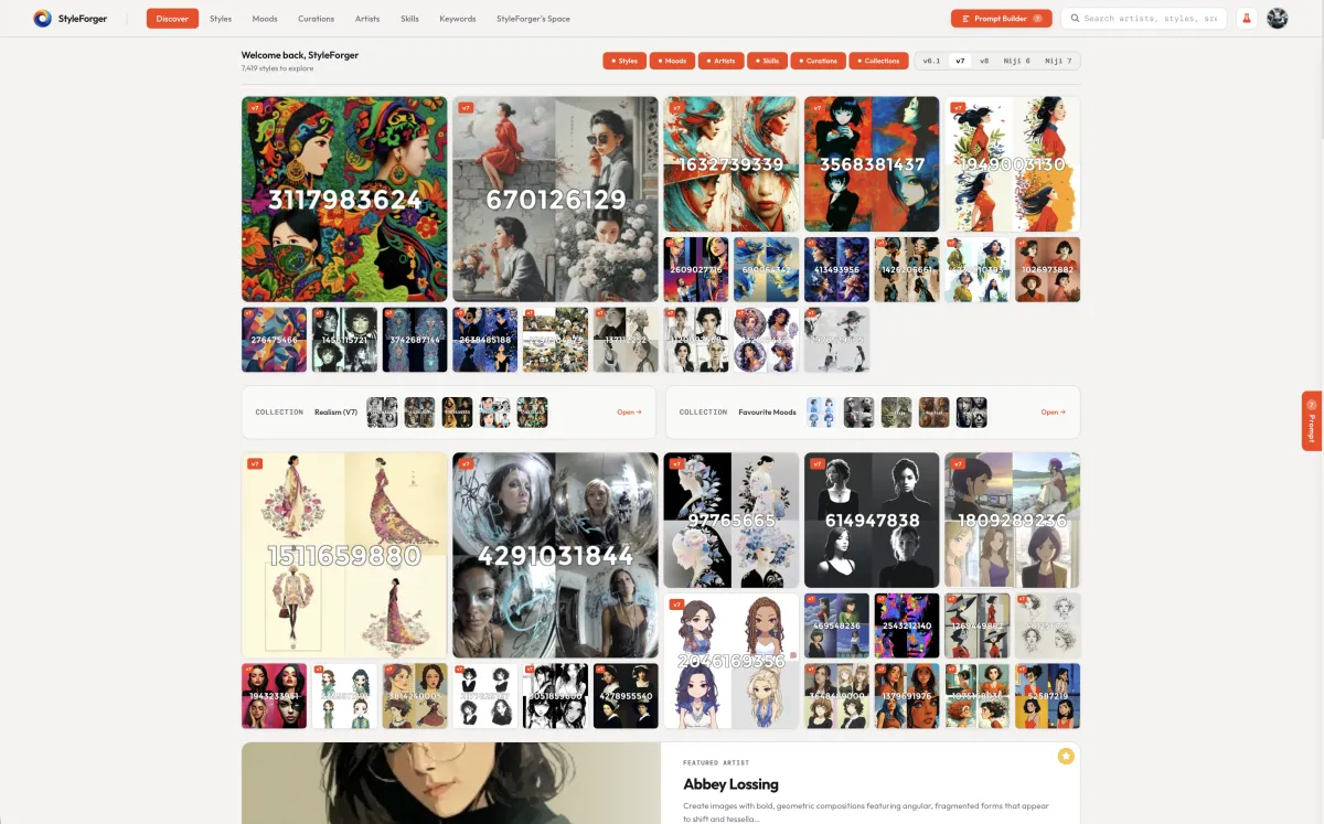 The core of StyleForger is a curated style library — hundreds of styles across Midjourney v6.1, v7, Niji 6, Niji 7 and soon v8, all browsable and searchable. But the real power is in how everything connects.